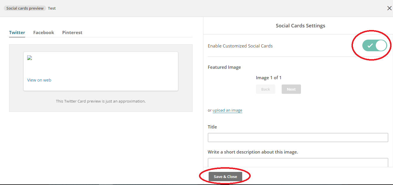 Enabling social cards will allow you to select the images and write the accompanying text. Make sure to click 'Save & Close' after you're done.