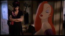 Later that night, outside Maroon Cartoons, Jessica hits Roger's head with a frying pan and throws him into the trunk of her car, then turns her attention to the window of Maroon's office where she hears Maroon and Eddie talking. After Maroon's murder, she runs to her car and seen by Eddie just before he exits the building, making Eddie believe she was Maroon's killer. The car chase begins, as he tries to follow her, but she disappears into a tunnel leading to Toontown.